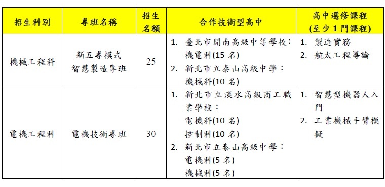 115學年度技術型高中與科技大學合作3+2新五專模式專班招生公告